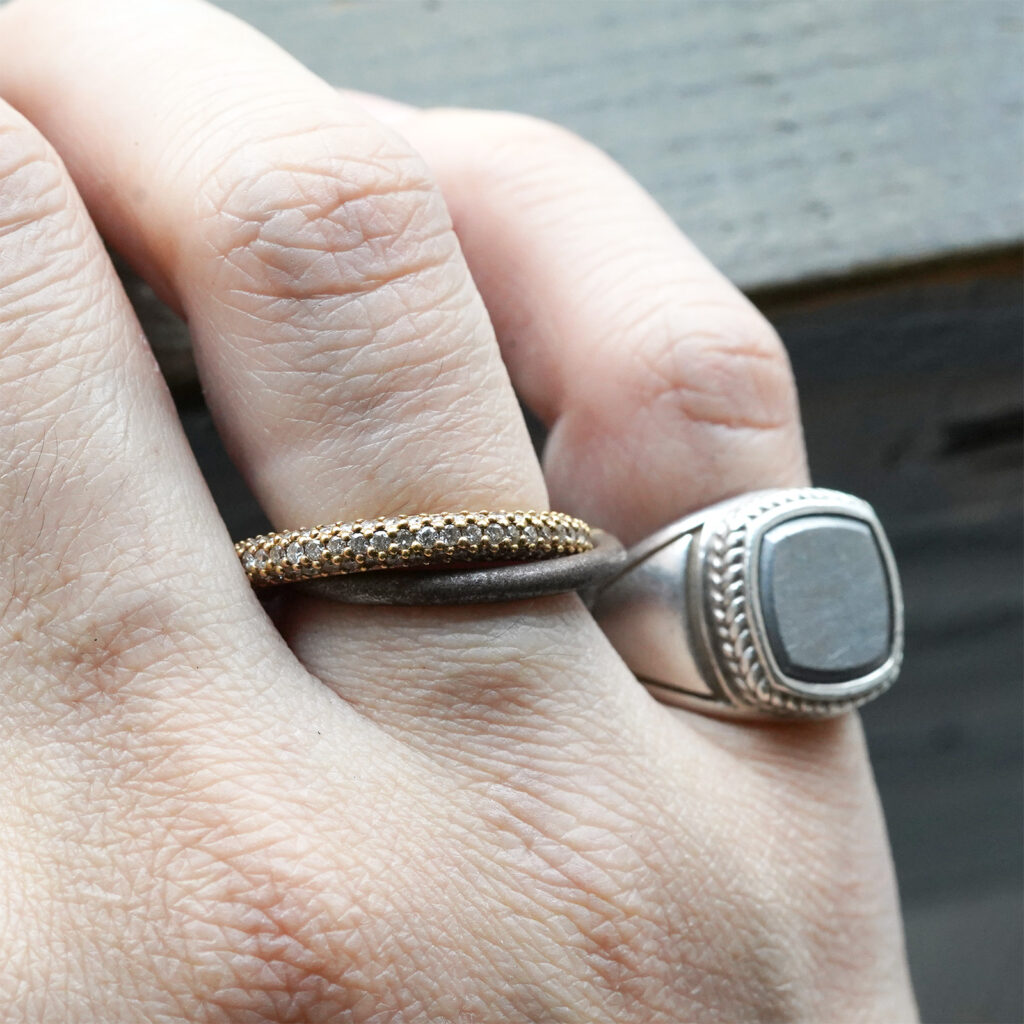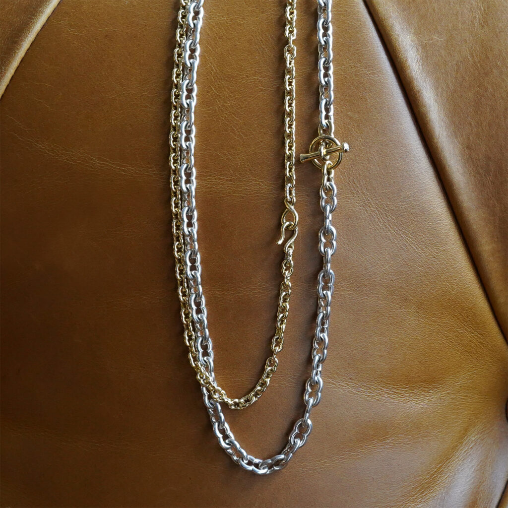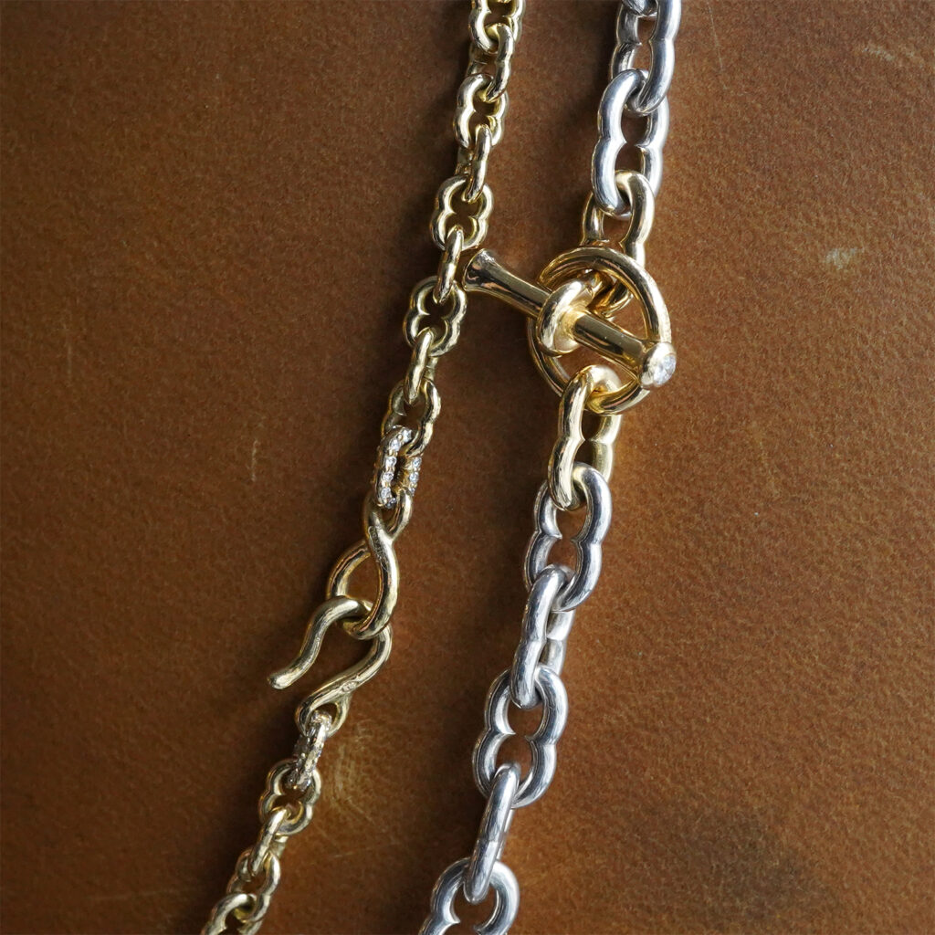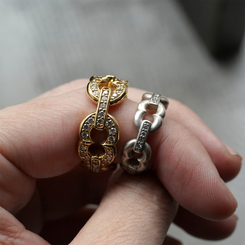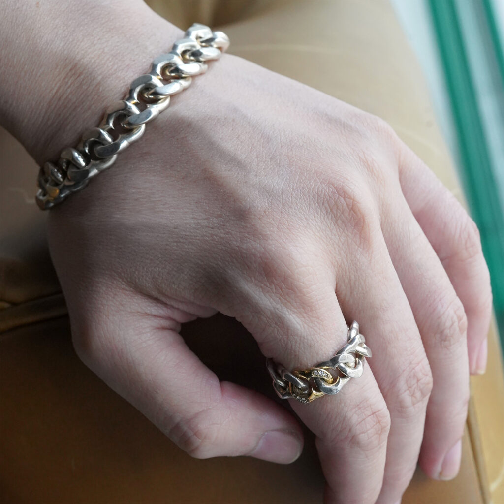 多くの場合、様式の再配置によって成るジュエリーの世界における「オリジナリティ」をその洗練された構造や抜かりないクオリティを以て追求し続けてきた増﨑氏が展開する、シンプルな図形の組み合わせやバランスの機微を捉えたラインナップはスケールの違いひとつをとってもその印象を大きく変化させ、身につけるうえでの発見と趣を携えています。