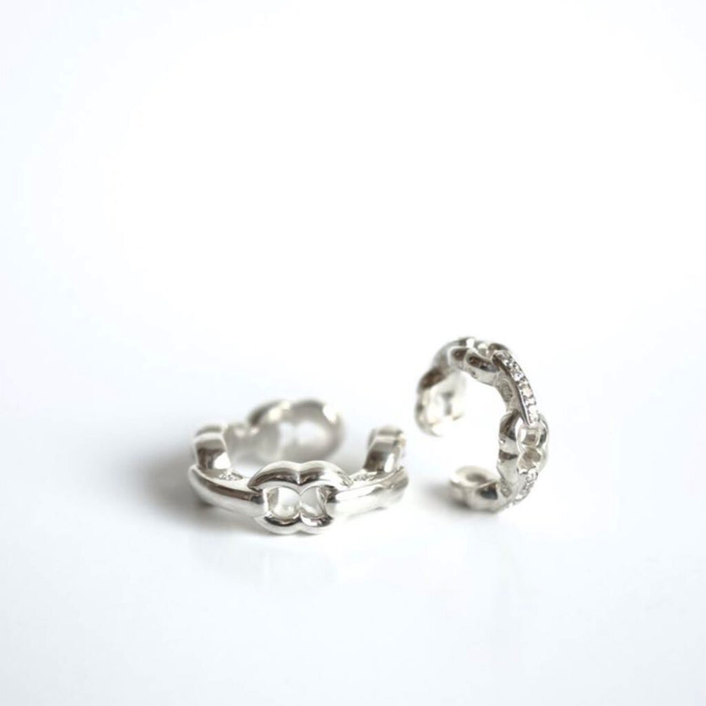 ブランドを象徴する、侵食し合う2つの新円から構成されるIMPLOSIONアイコンから展開されるシリーズのイヤカフはGIFTEDの流れにありながら新アイテムということもありどこか新鮮な空気を纏っています。