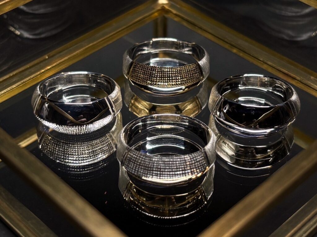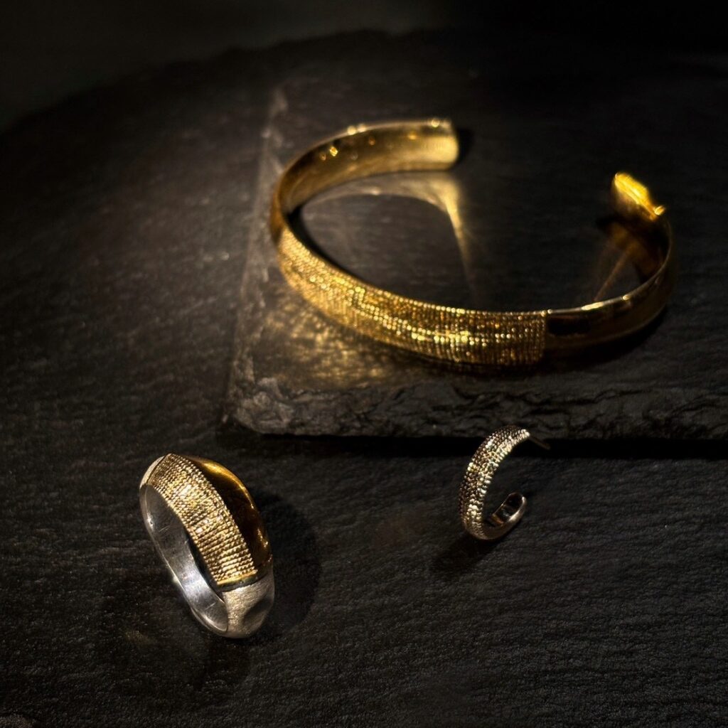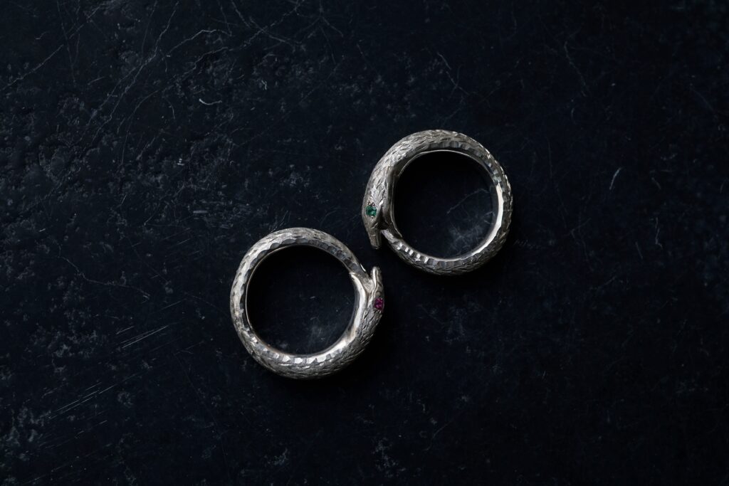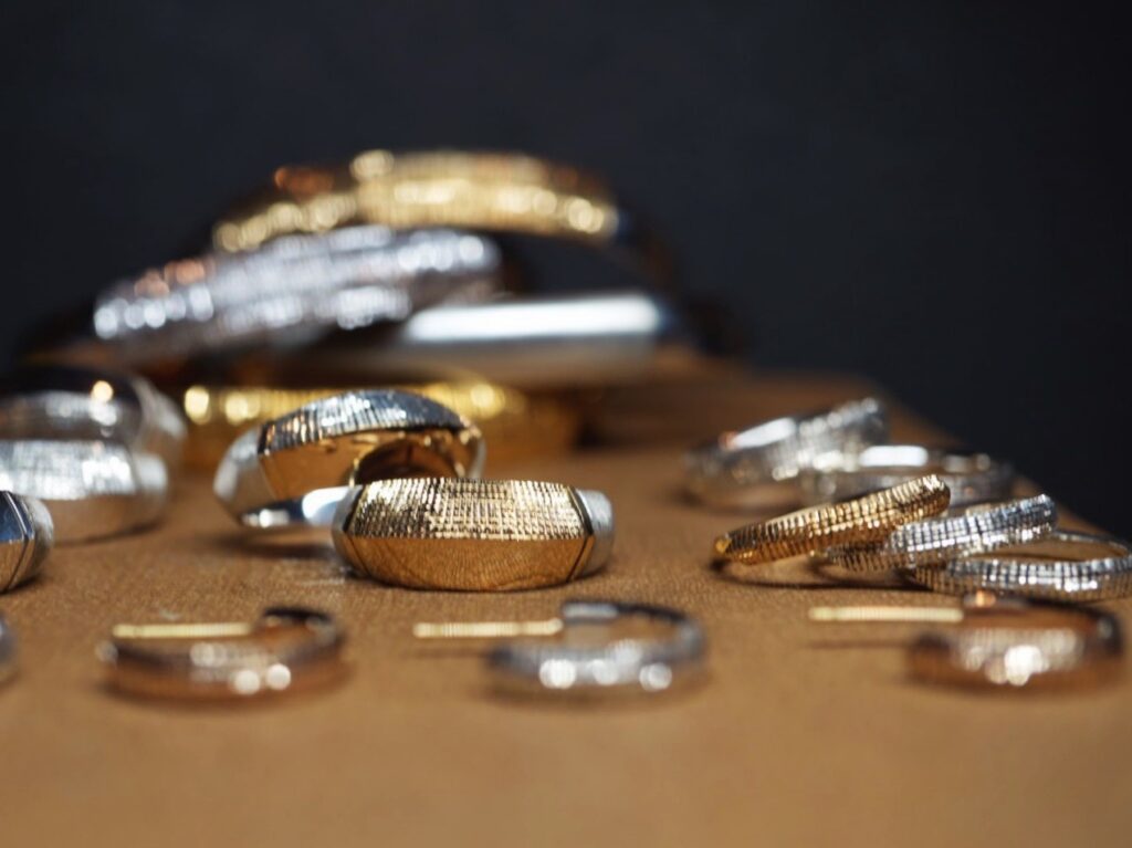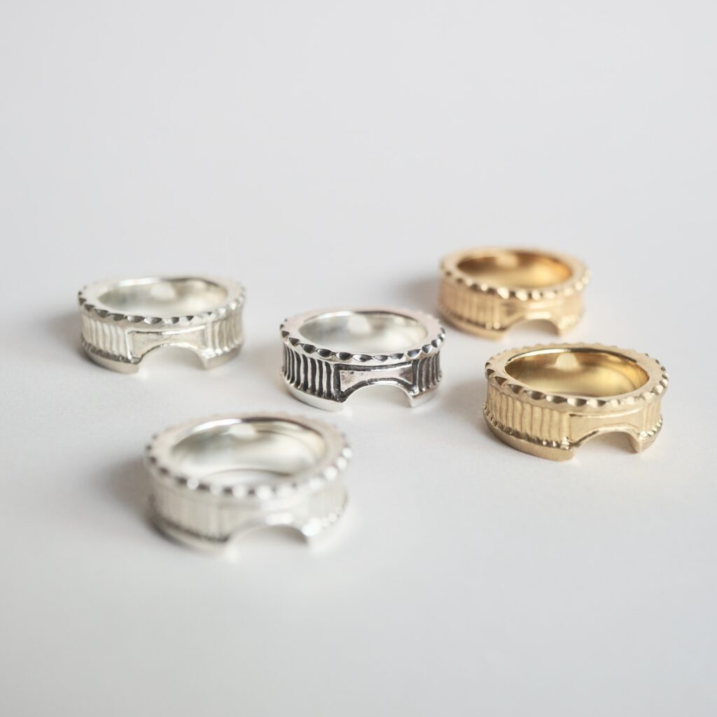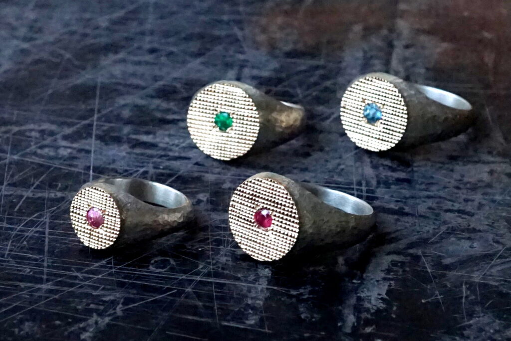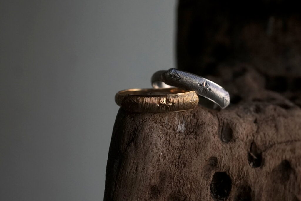 「発展の道」と訳されるこの会期では、フープ型のピアスや甲丸形状のバングル、従来よりも細身の造形や天面にエッジを利かせたデザインのリング等といった新作をはじめ、GERMEDEUR作品におけるアイデンティティ・象徴とも言える彫りの技巧が堪能できる品々をご紹介します。