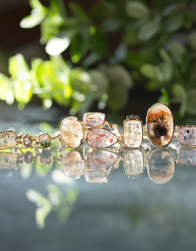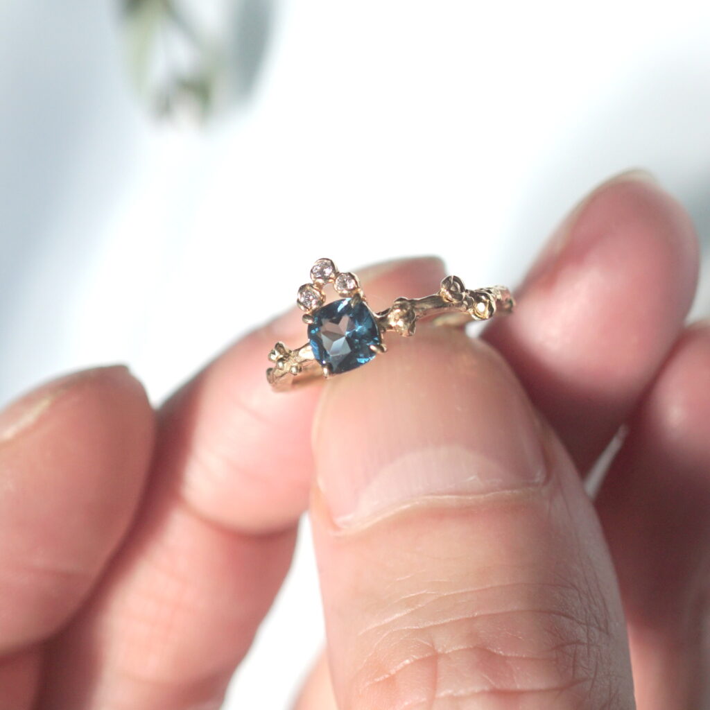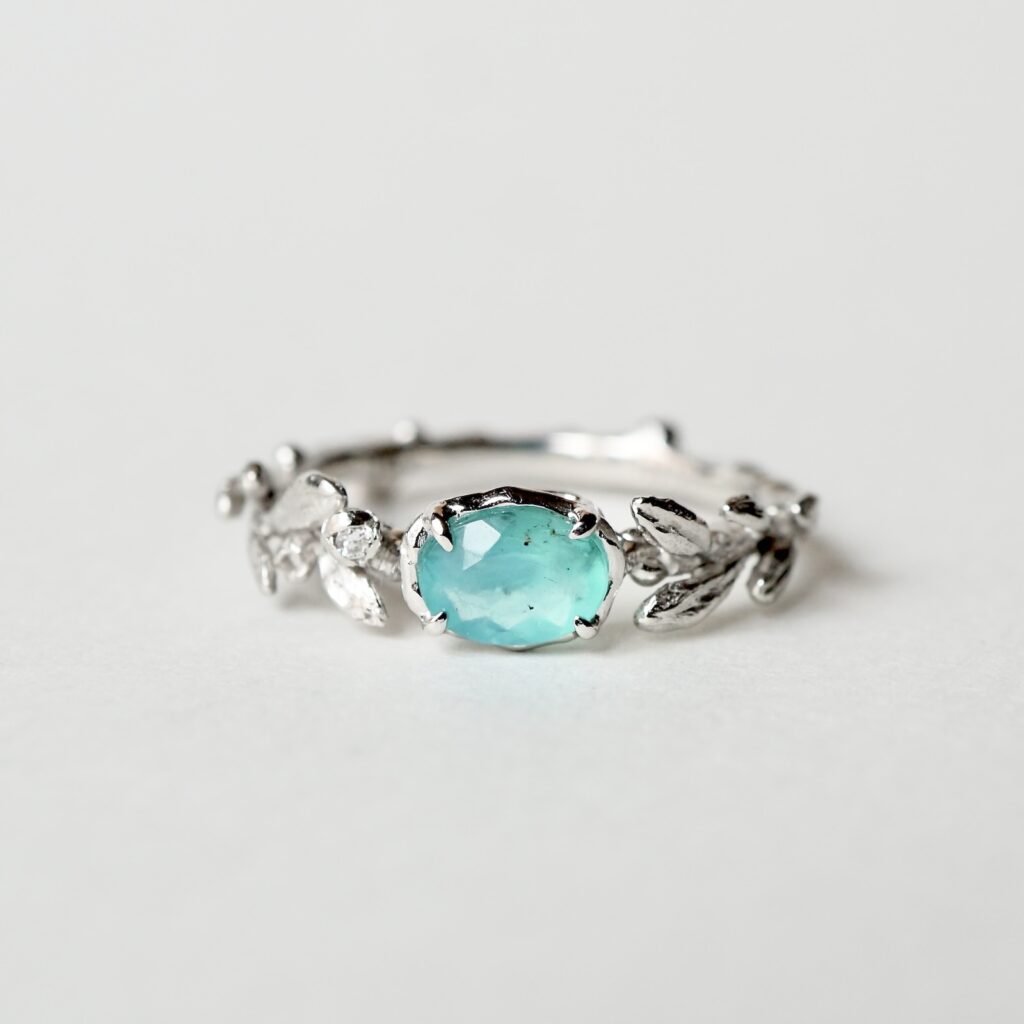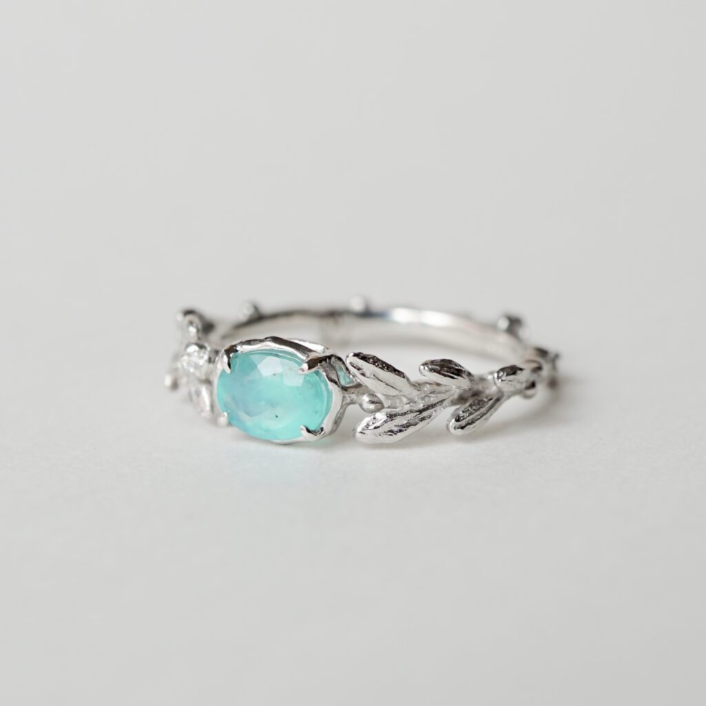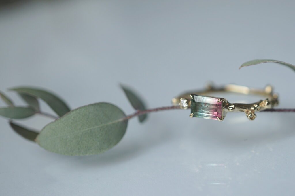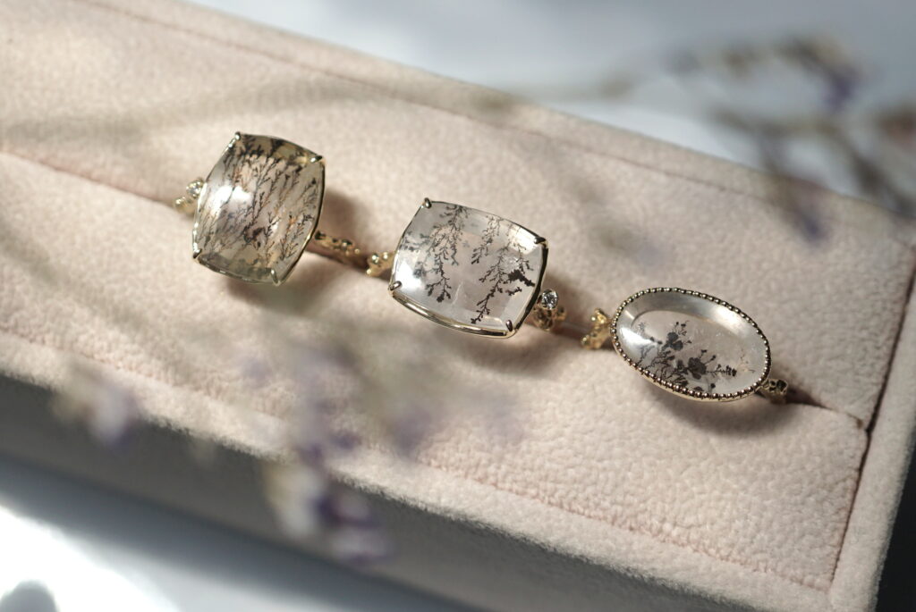 庭師が自宅の温室で育てる木々や草花、移り変わる季節などを想像させる石を1つずつ集めて指環に仕立てています。