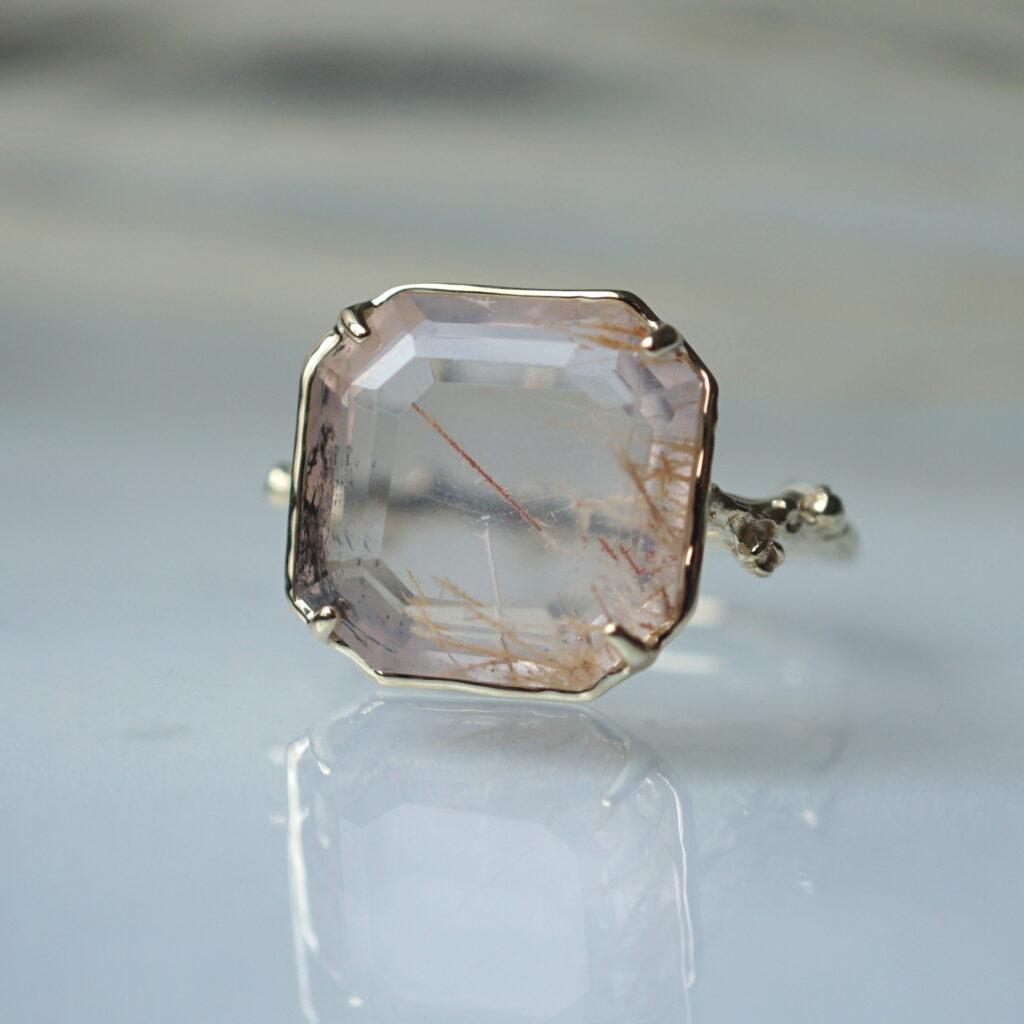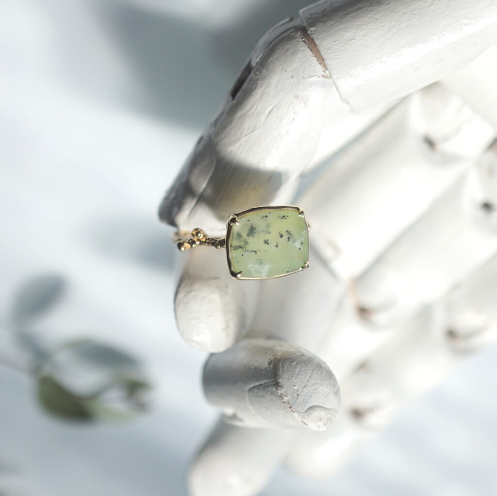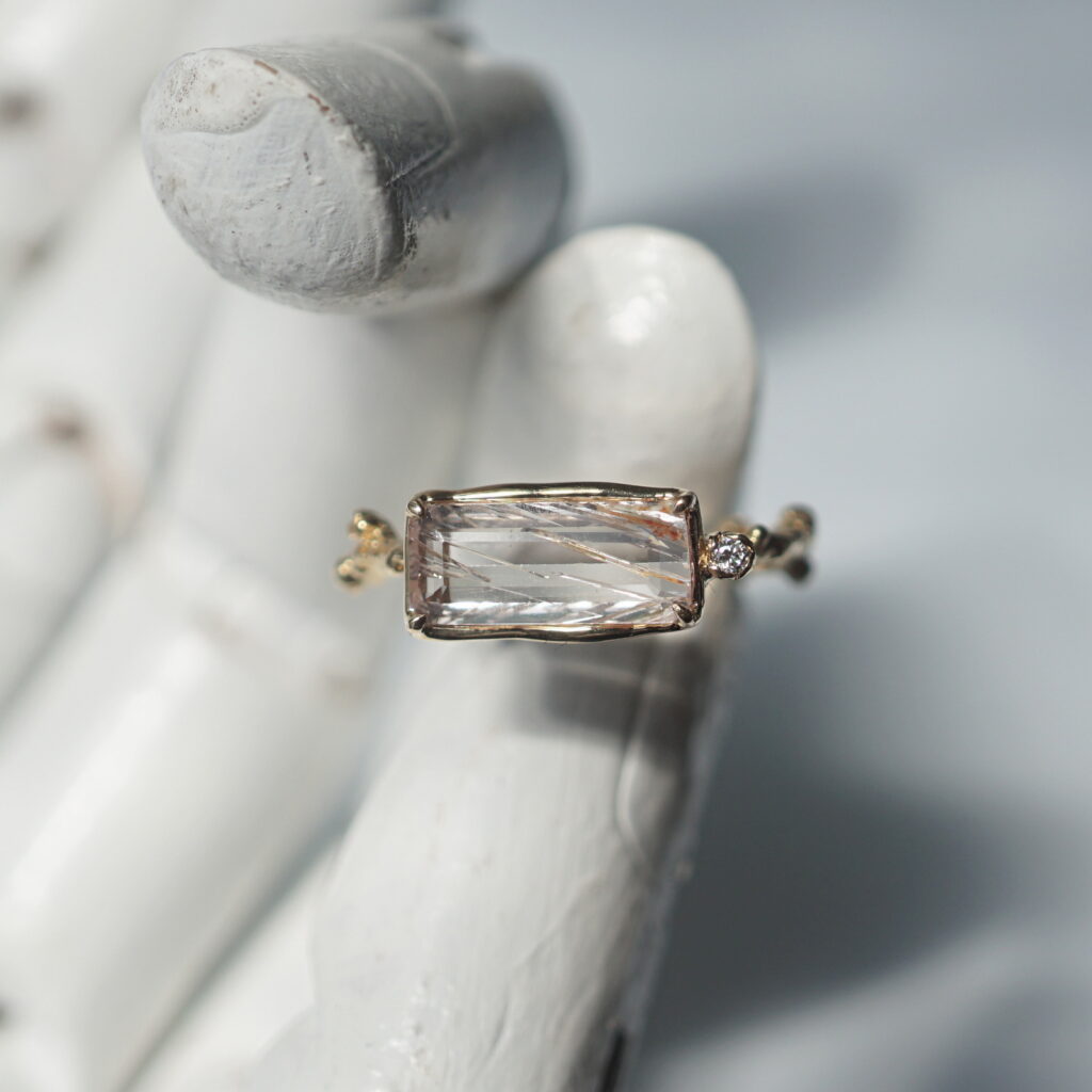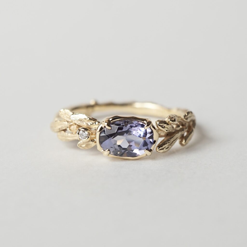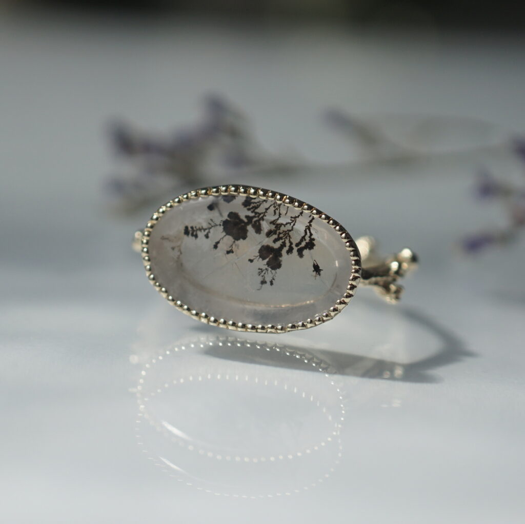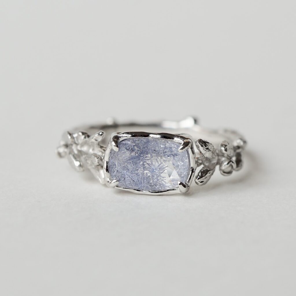 庭師が自宅の温室で育てる木々や草花、移り変わる季節などを想像させる石を1つずつ集めて指環に仕立てています。