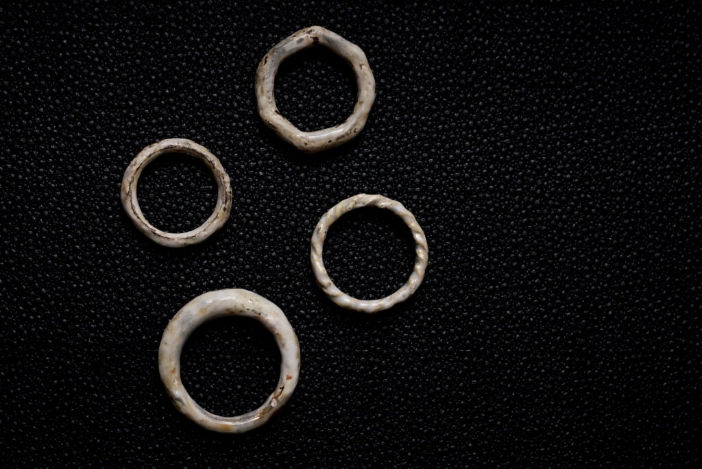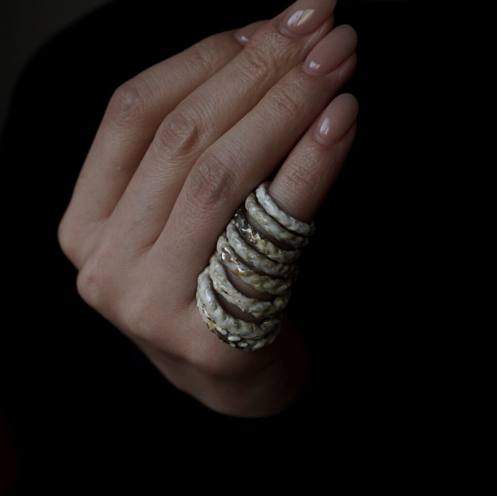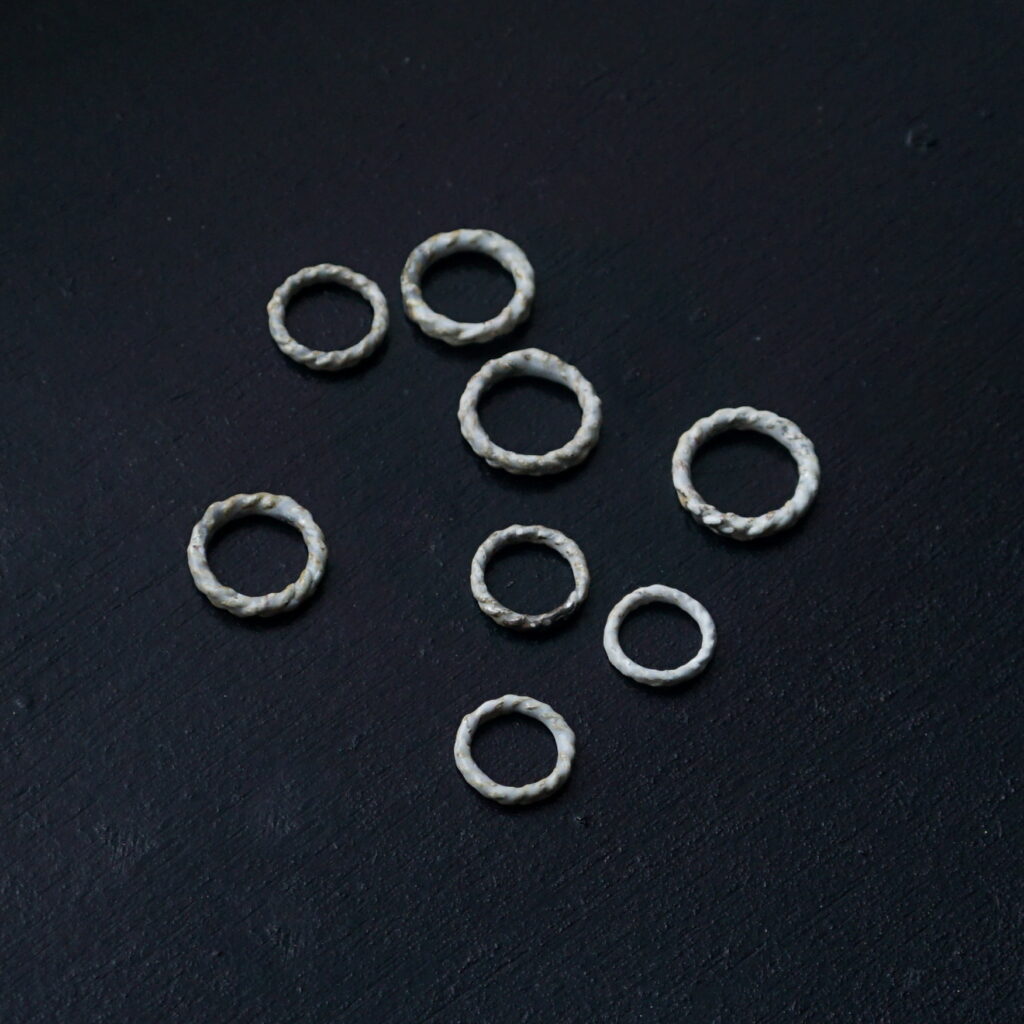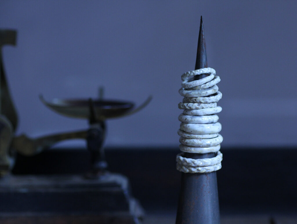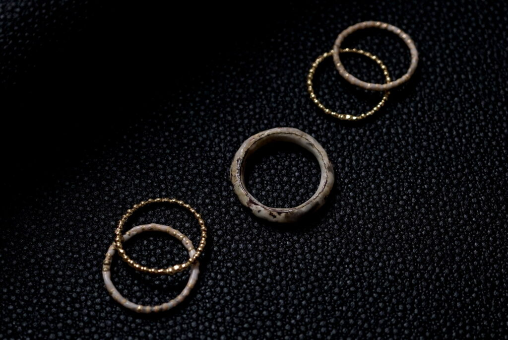 シルバーの上に白いエナメルを焼き付けて制作される古物の様な指環「ツモルトキ」