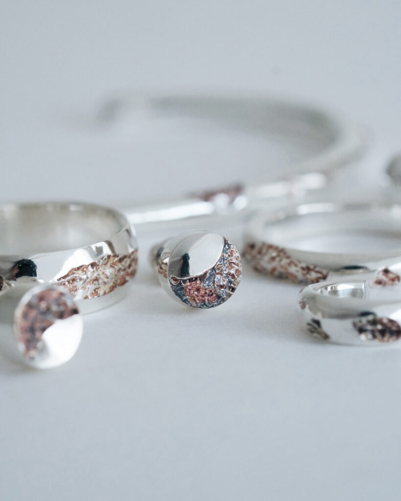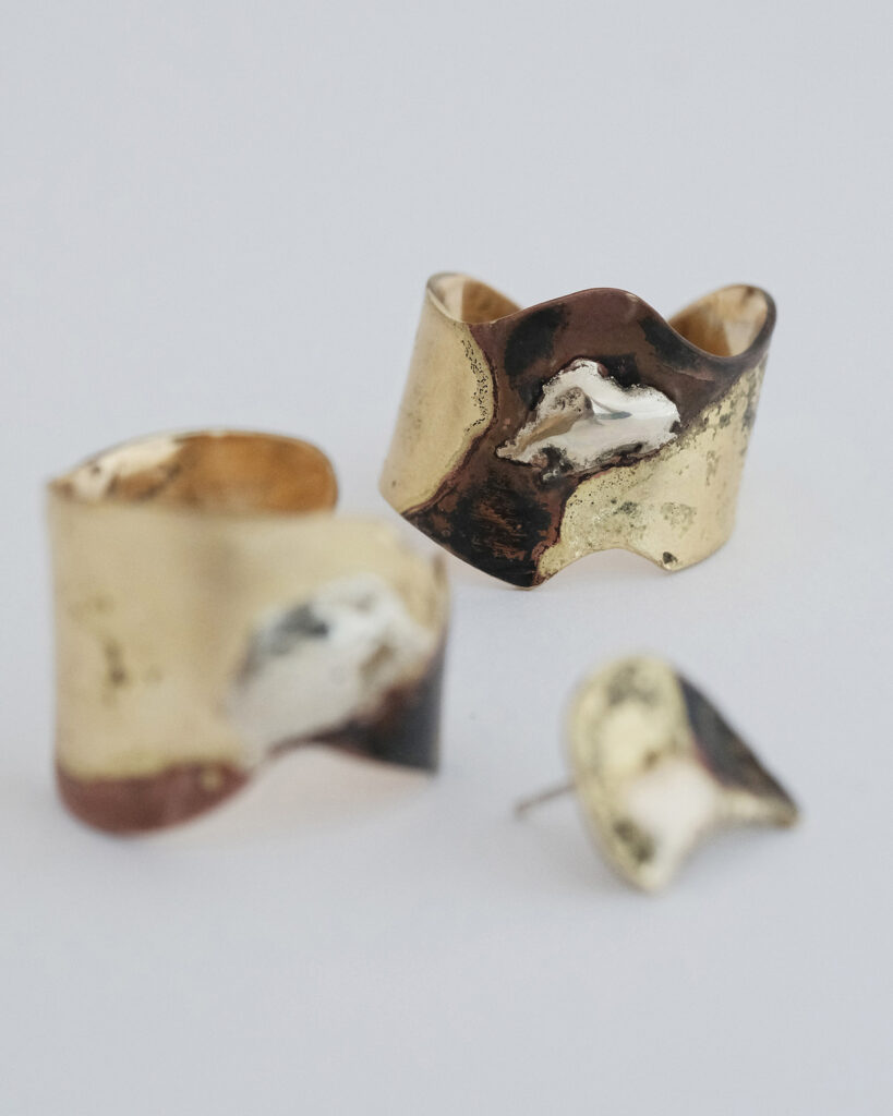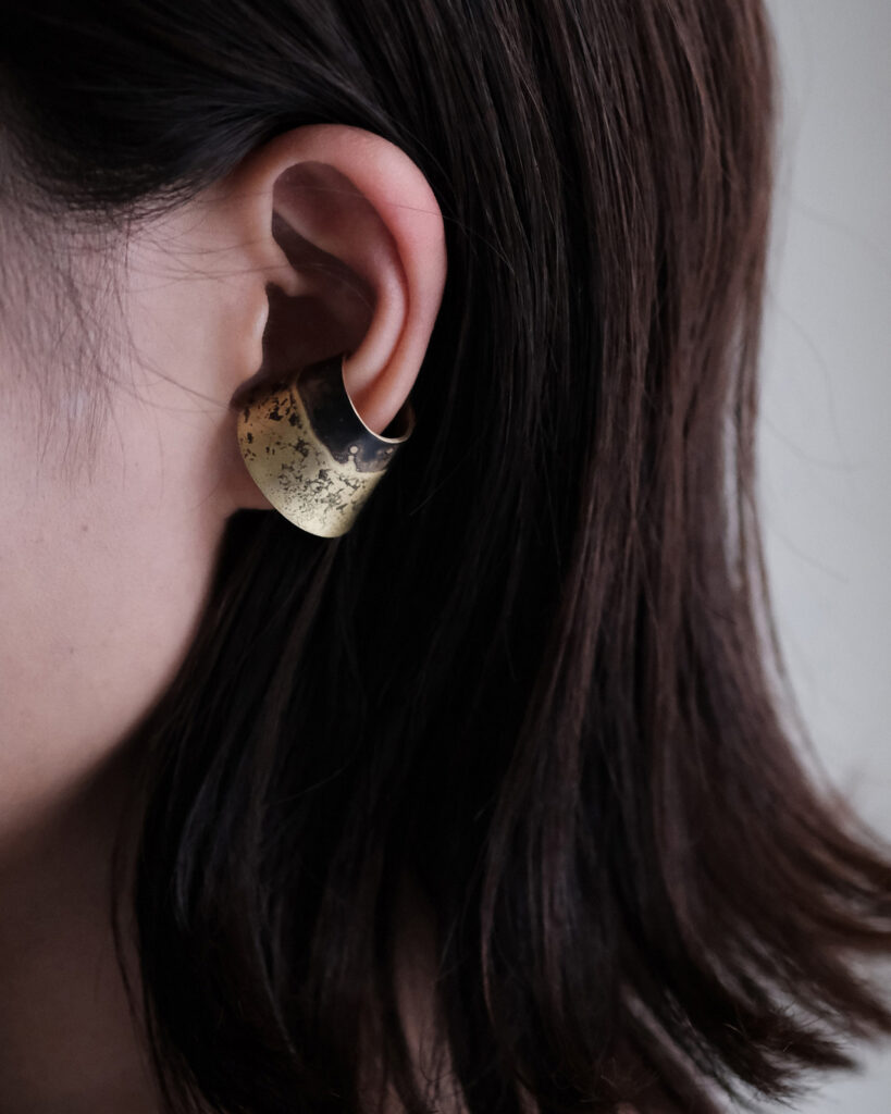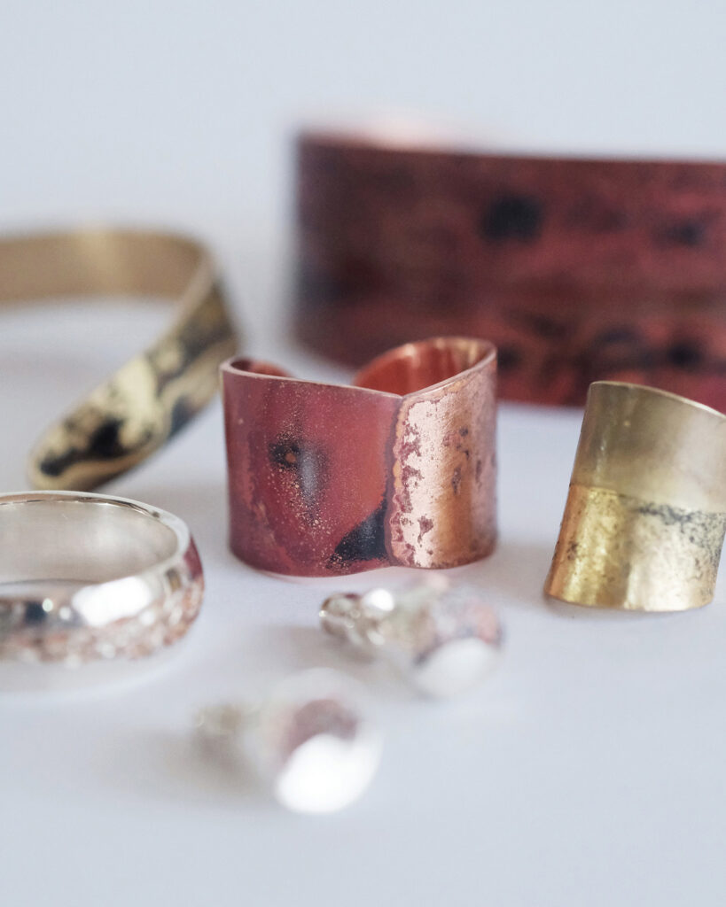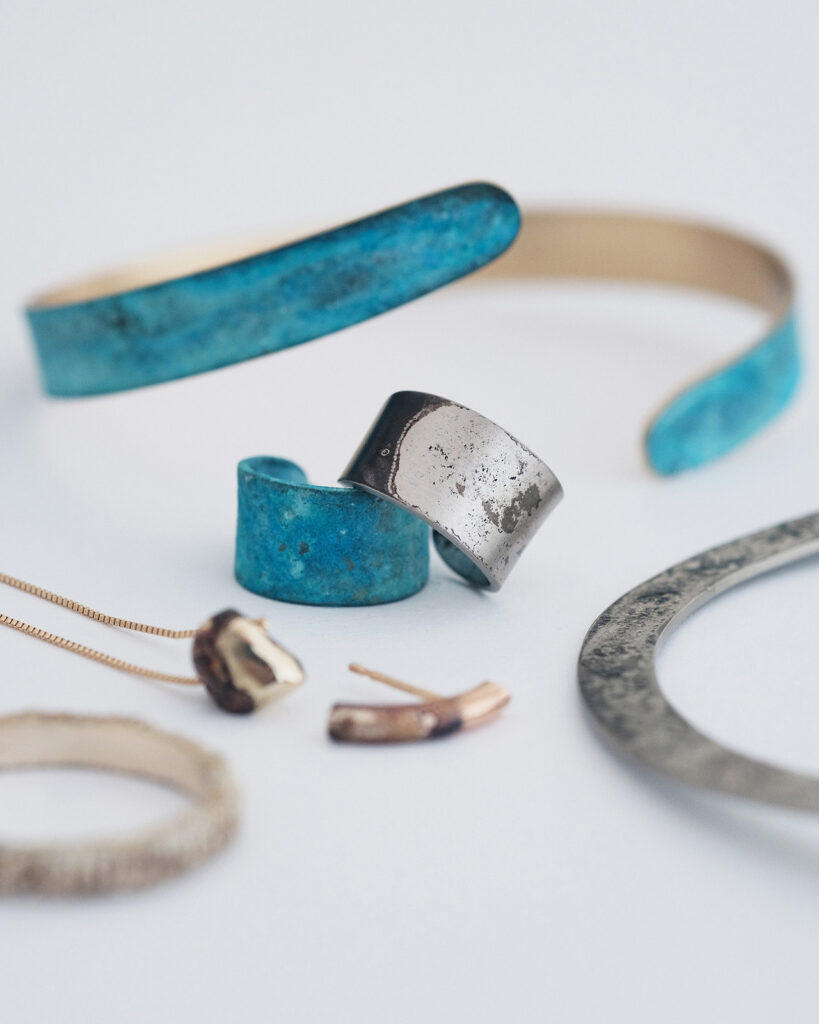 金属に泥を塗り、焼きつけ、錆びや色の揺らぎを引き出すことで生まれる一点一点表情が異なるジュエリー。