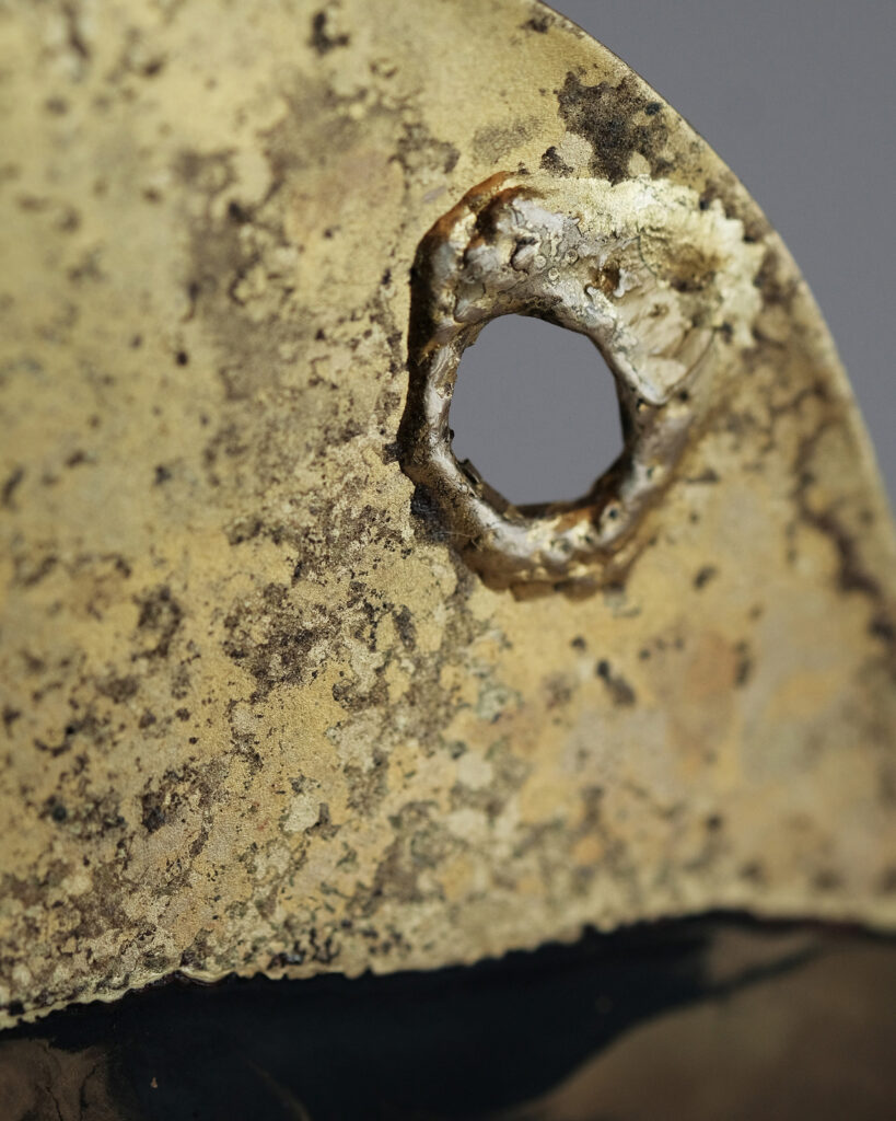 金属は炎の痕跡をそのまま引き受け、ひびや歪みを含んだ状態で立ち上がる。