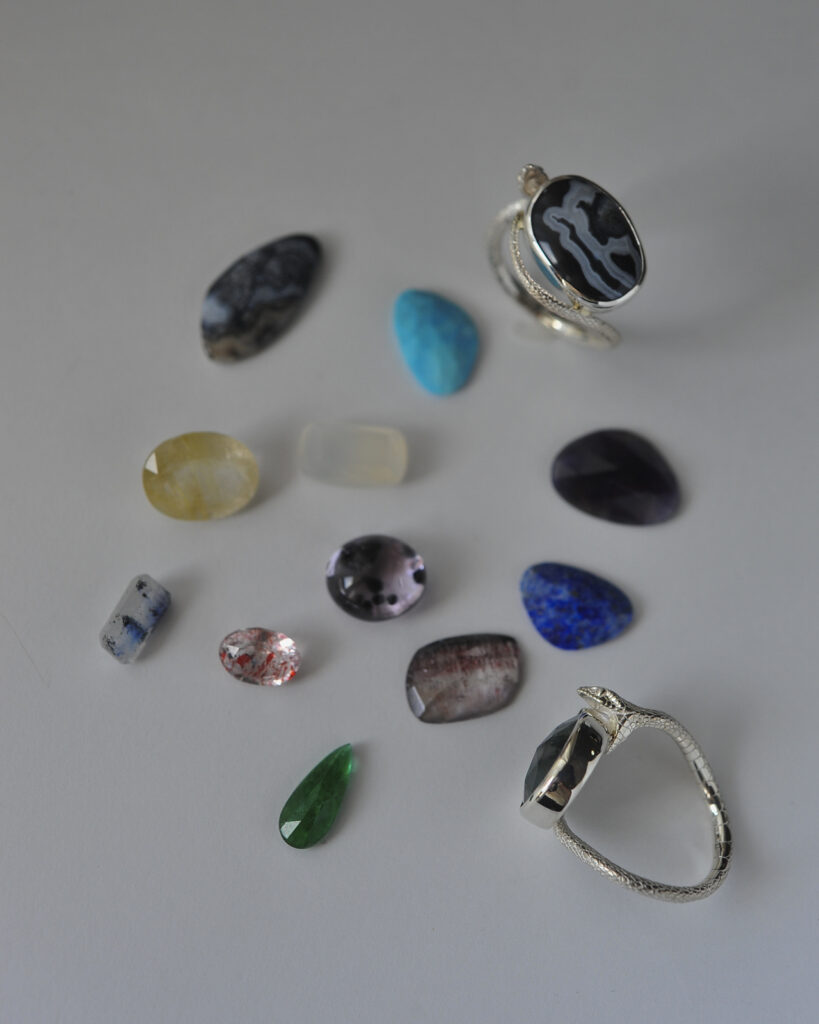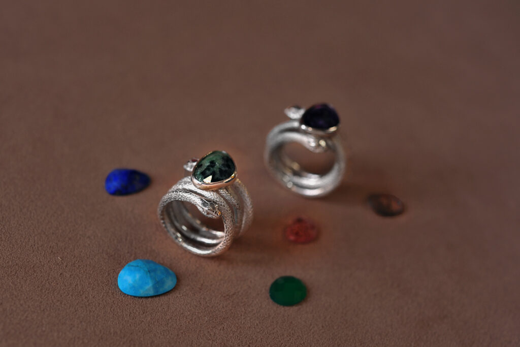Japanese rat snake Ring(ER-065)をはじめとしたアオダイショウ造形とBoom slang Ring(ER-137)の瞳へ主に用いられるルース(全てファセット)
