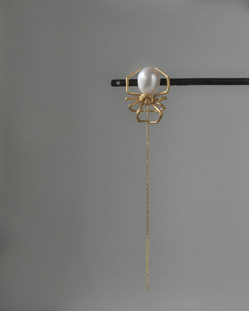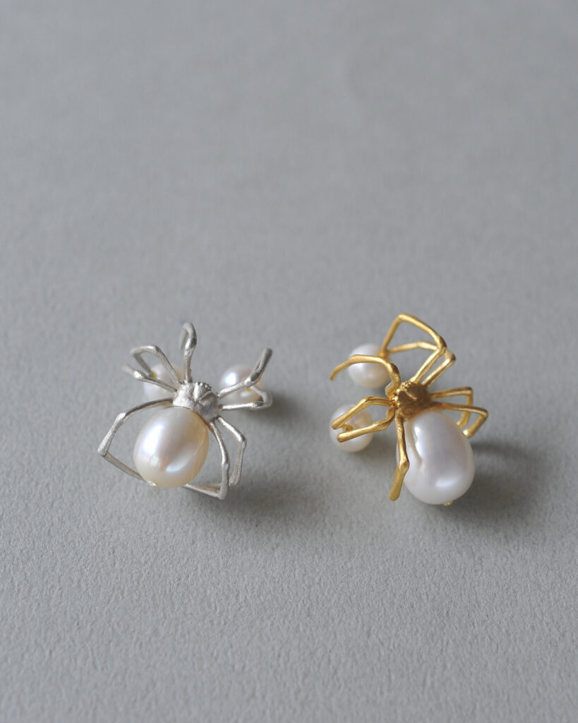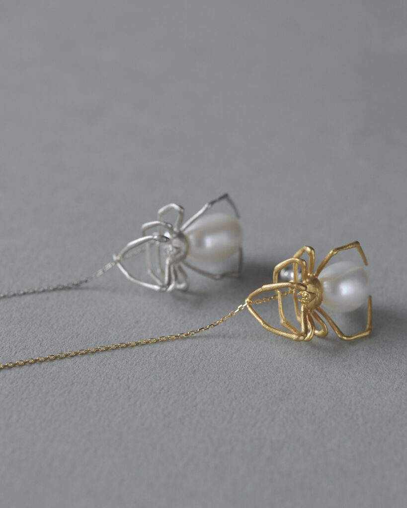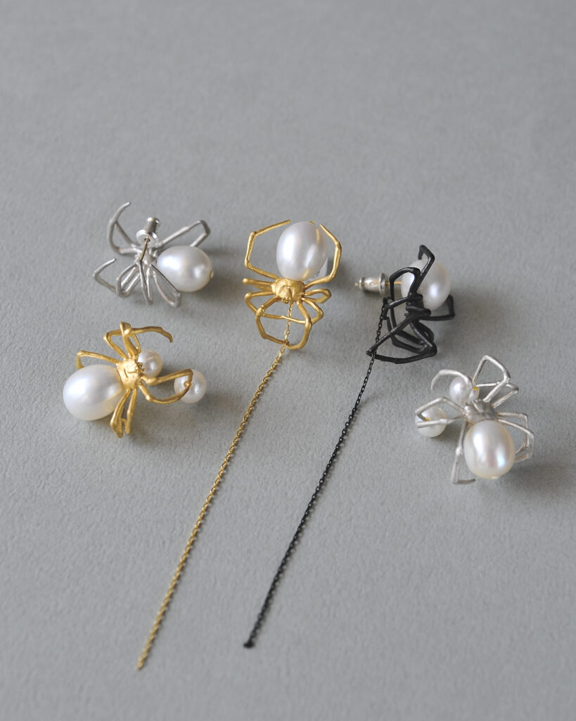 セアカコケグモをモチーフに制作されたピアスとイヤーカフ。会期中はブラックカラーやピンクゴールドカラーでのお仕立ても可能です。