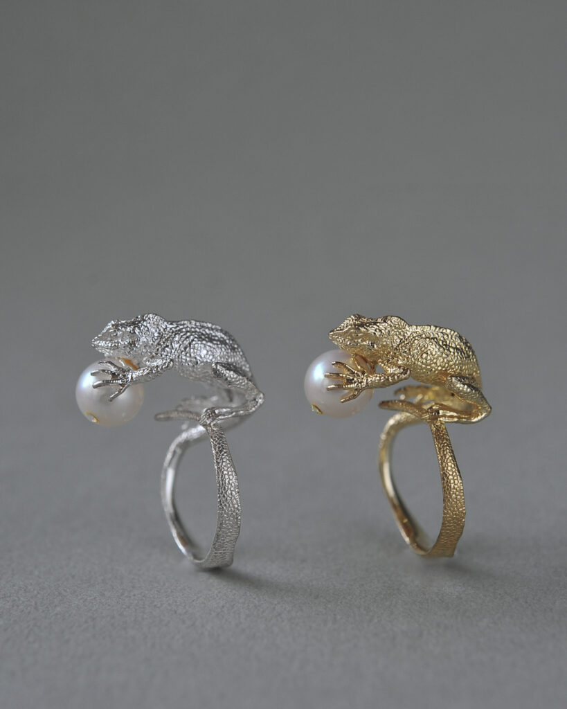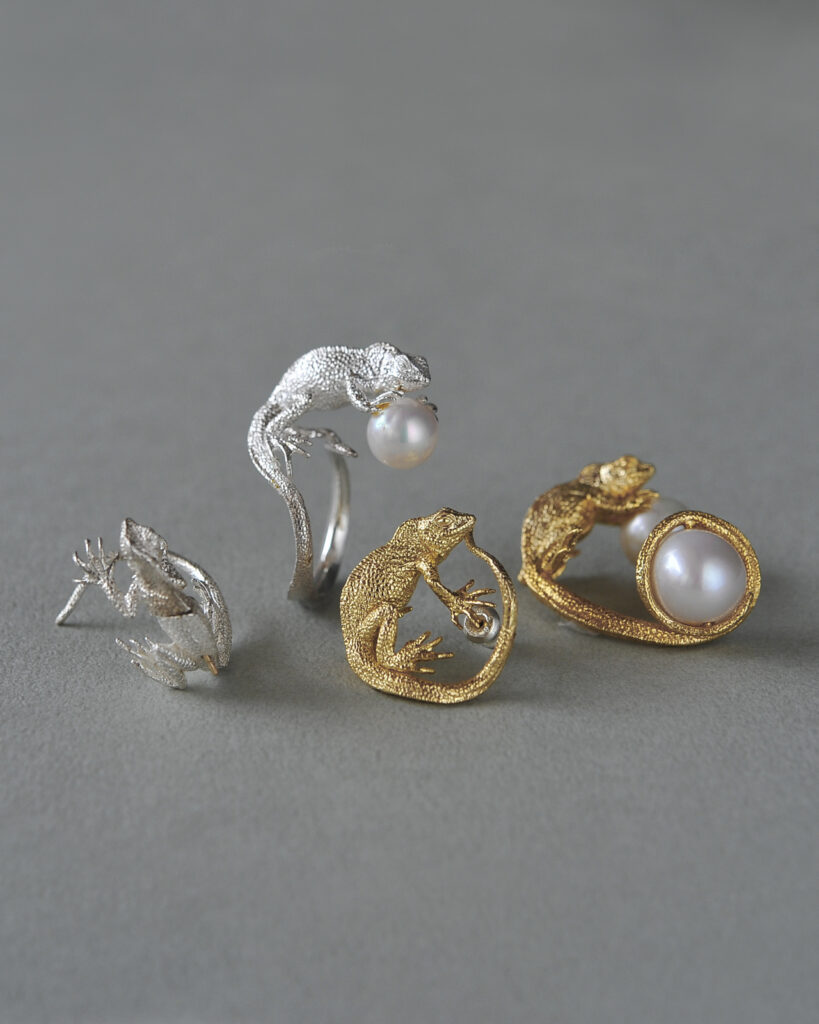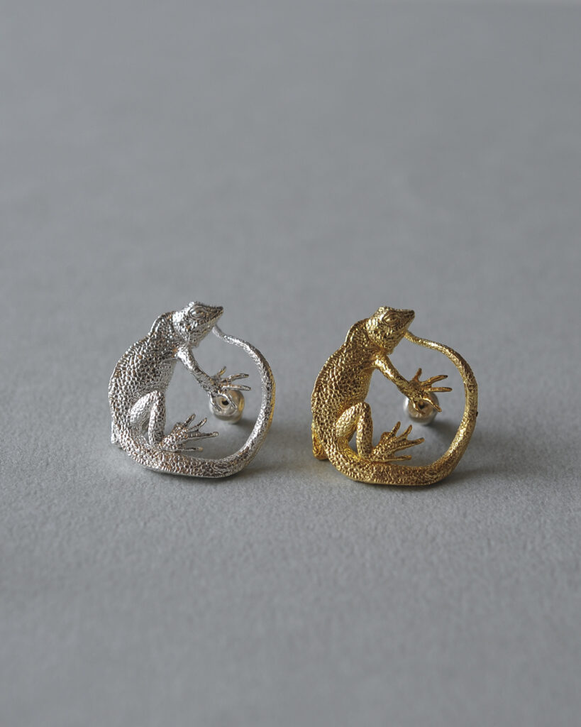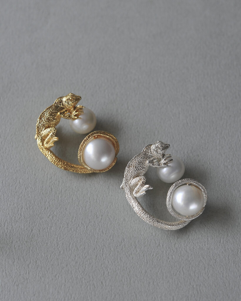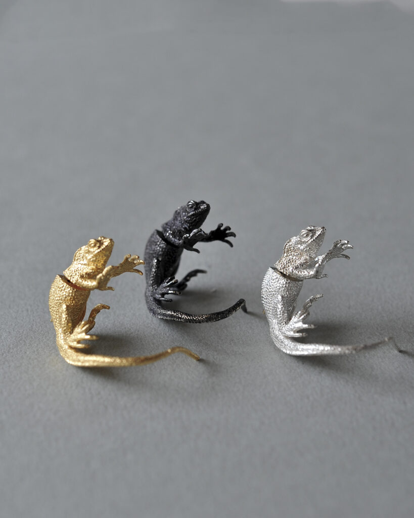 東南アジアに生息するインドシナウォータードラゴンをモチーフにしたモデル。リング・ピアス。イヤーカフの全4型の展開です。